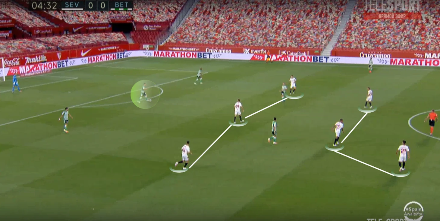 У «Бетиса» при билдапе в тройку центральных защитников стал опускаться Родригес, при этом в самом начале встречи были попытки у Аленья, но он был самым правым из тройки, а Родригес – центральный. «Севилья» откатывалась в средний блок, компактно выстраиваясь по схеме 4-3-3