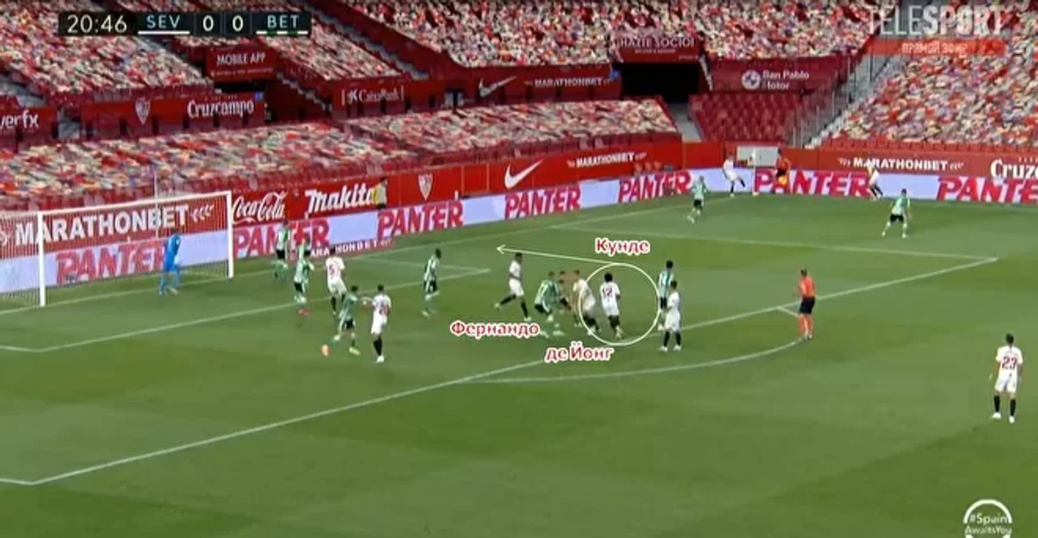 Снова «Бетис» обороняется двумя группами, а подача идёт на врывающегося Мунира. Дальше была скидка на де Йонга – Люк хорошо играет головой, и ситуация выглядит логичной и продуманной (далее на нём сфолили)