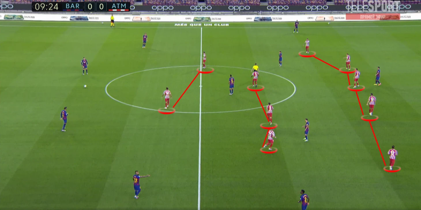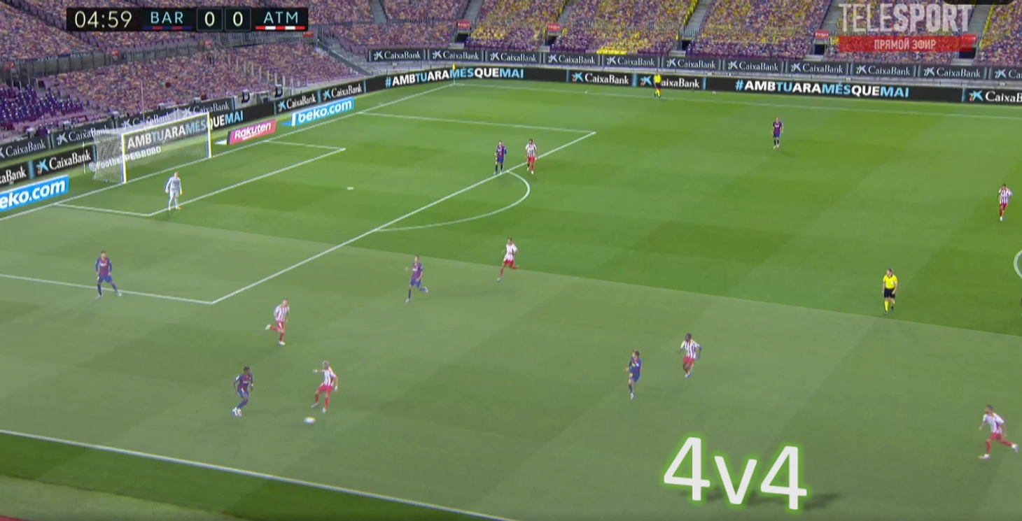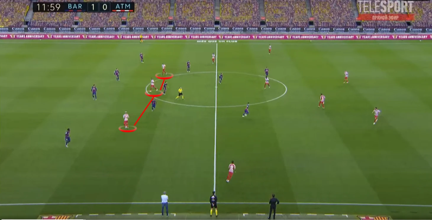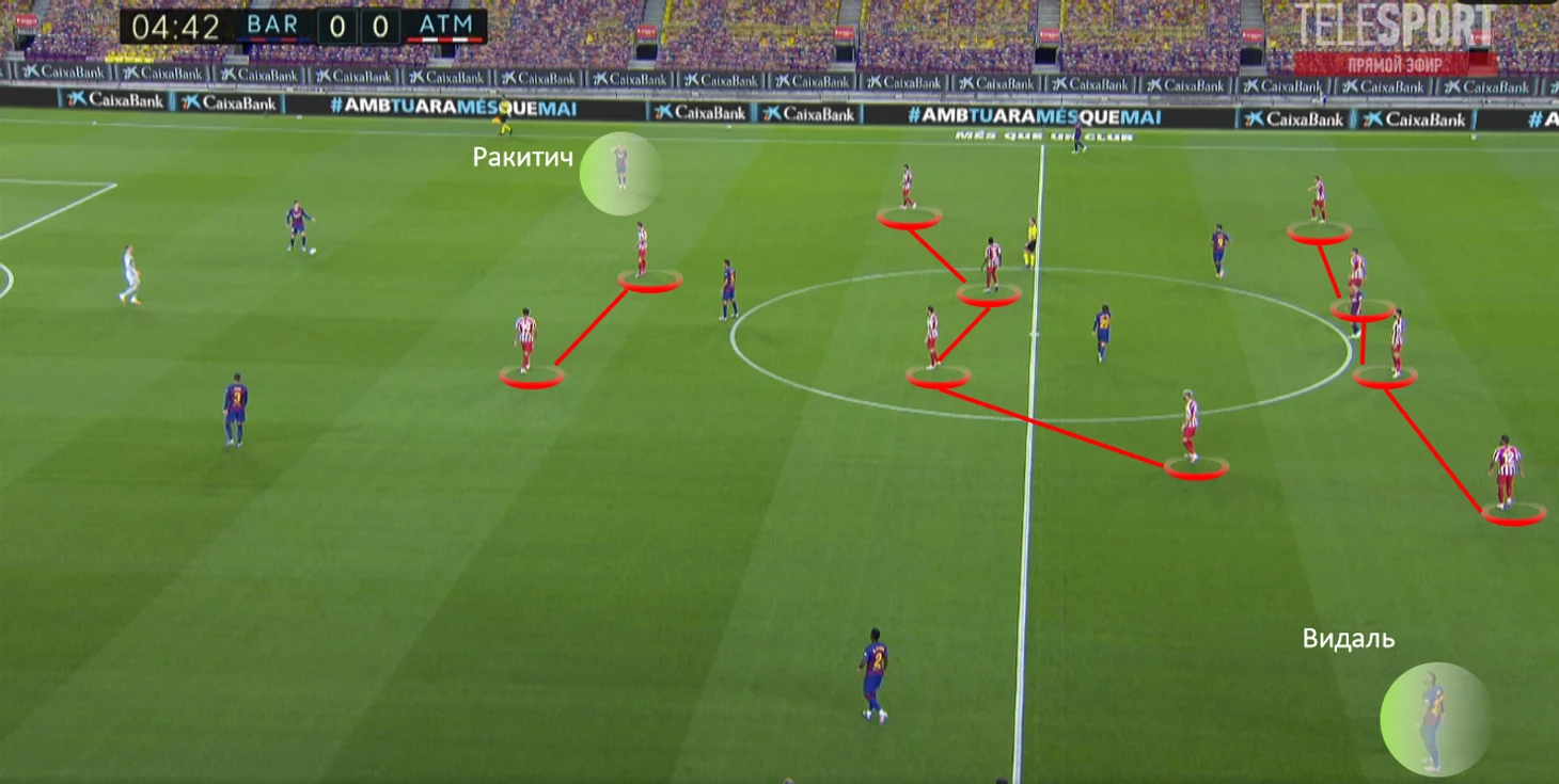 Обратите внимание и на того, кто при прессинге накрывает Бускетса — это Сауль. Тоже достаточно смело решение, учитывая, что зачастую конкретно против «Барсы» эту роль исполнял Коста, а вся команда откатывалась ниже.