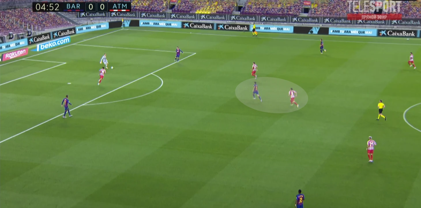 Опускания «восьмёрок» часто используются, в том числе многими командами Примеры; у того же «Атлетико» в матче первого круга похожим образом оттягивался Эррера, а потом «Барса» скопировала этот приём через действия де Йонга. Такой метод позволяет фланговым защитникам открываться выше, чем обычно. Но здесь важнее другое: почти не было смещений вглубь третьим центрбеком от Бускетса — необычная ситуация для «Барселоны».