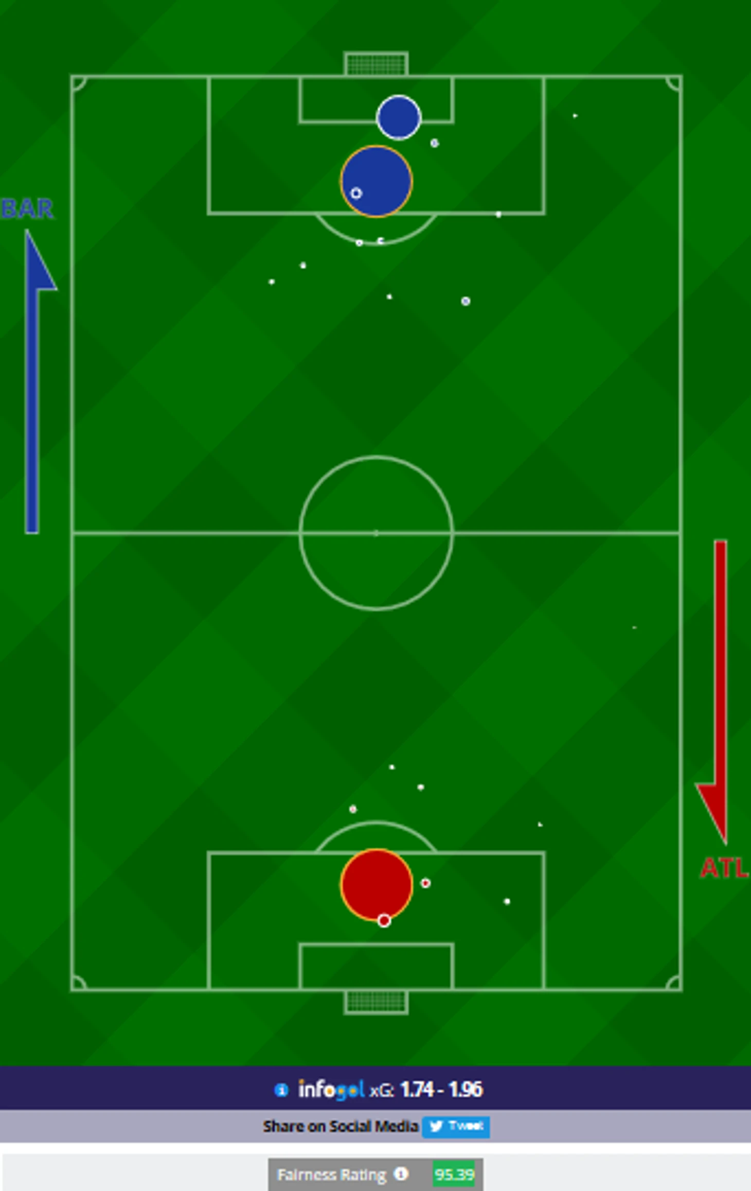 Если обратиться к xG, то большинство компаний выдают минимальный перевес «Атлетико» по созданным моментам (только по Understat «Барса» впереди, мы используем их данные в графике с расстановкой — прим. «Реджиста»). Это в целом сходится с субъективными впечатлениями: достаточно равный матч, но у «Атлетико» чуть больше остроты. Иногда не хватало последнего паса или удара, хотя ситуация казалась весьма благоприятной (момент у Лемара в конце матча, например).
