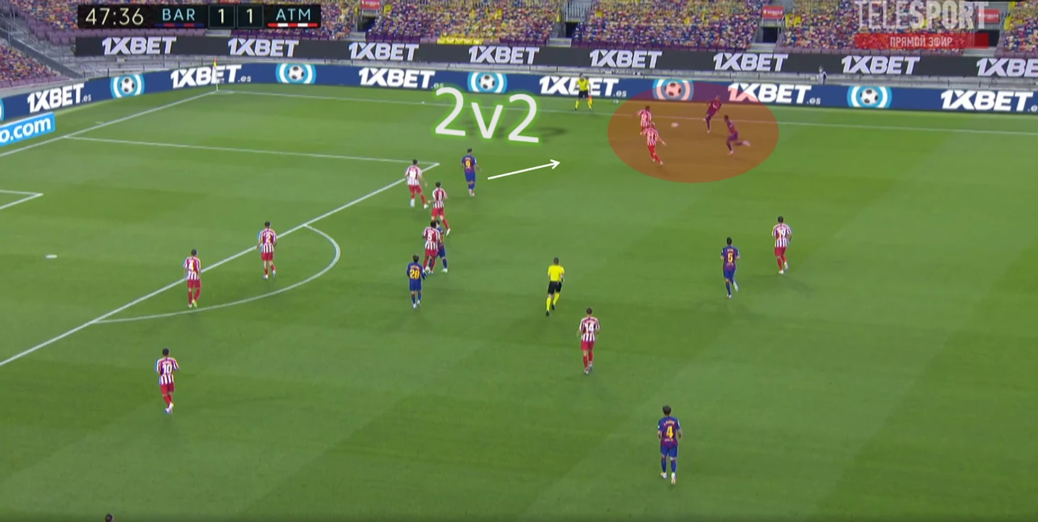 После перевода с фланга на фланг (не одним пасом) слева образовалась ситуация 2v2, которую Суарес превратил в 3v2 для «Барселоны». Для Семеду образовалась зона, куда он и ворвался