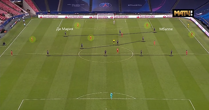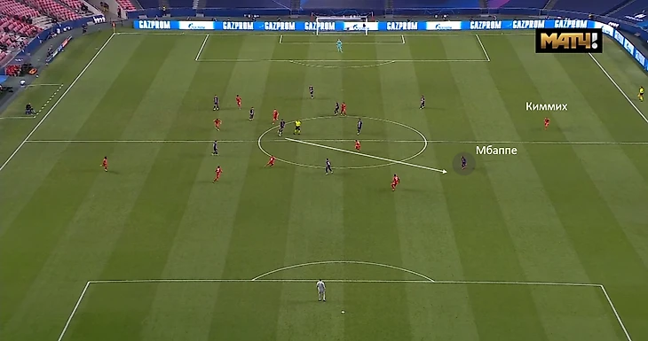 Типичная контратака ПСЖ – Киммих располагается очень высоко, Мбаппе получает много свободы, передача идёт как раз на него