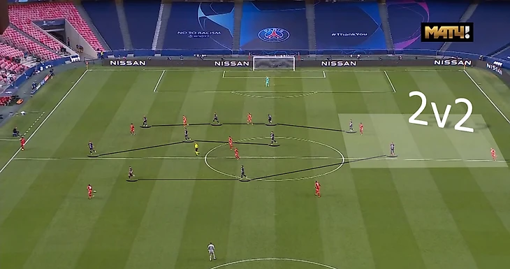 Но главная проблема заключалась в том, что бонусом к моментам из ситуаций вроде той, где Киммих задержался выше, и Мбаппе остался один, шли ещё и эпизоды вроде передачи Паредеса. «Париж» рушил структуру Флика и при помощи тонких решений (и за счет действий конкретных игроков, следовавших после этих решений), к тому же мог свои сильные стороны демонстрировать Мбаппе – на пространстве он способен уйти почти от любого из защитников «Баварии». Дэвис, который мог бы поконкурировать с Киллианом, играл на противоположном фланге.