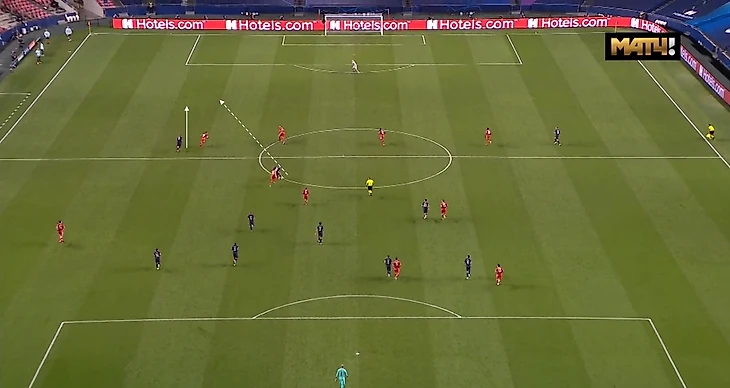 Интересно, что ПСЖ продолжал разрезать оборону «Баварии» и не оставлял попытки атаковать на скорости, но стоит всё же отметить, что «Бавария» оборонялась прагматичнее, чем в первом тайме, о чем говорит численное превосходство в данном моменте