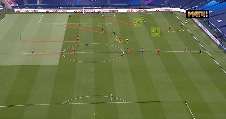 И стоит сказать, что в конкретном типе эпизодов риск, если уместно так говорить о подобном расположении «Баварии», уместен на все 100%: обостряющая передача низом не проходит – остаётся только выбивать («Бавария» успевает перестроиться), либо отдавать назад («Бавария» тоже могла бы успеть перестроиться, но те варианты контролирует Левандовски – дальше команда вполне могла бы помочь ему в прессинге, подвинув компактный блок чуть выше. В итоге ПСЖ просто потерял мяч.
