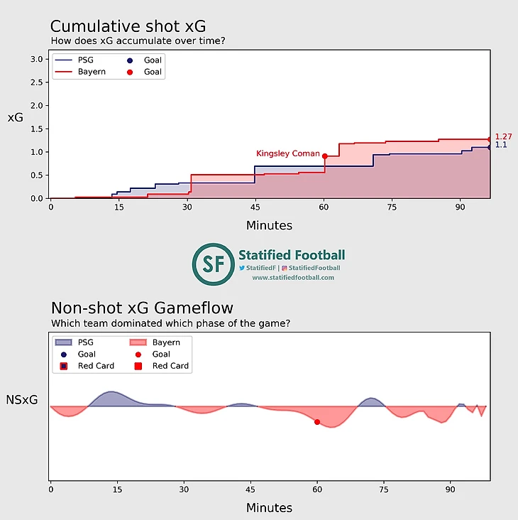 Это график по Non-Shot xG: обратите внимание на сильное проседание в сторону «Баварии» в начале второго тайма. Это отрезок её тотального превосходства
