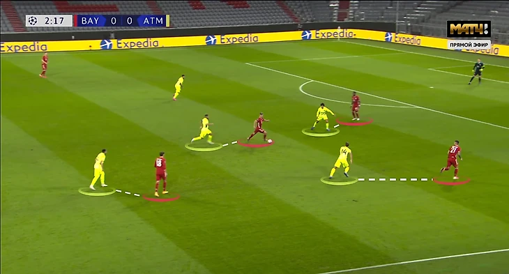 Местами план работал: удавалось перевести мяч с правого фланга на левый, и это давило на слабости прессинг-модели «Баварии» — они, оставаясь в рамках 4-2-3-1/4-4-2, компактным блоком перемещаются с фланга на фланг и в ограниченных зонах накрывают соперников персонально
