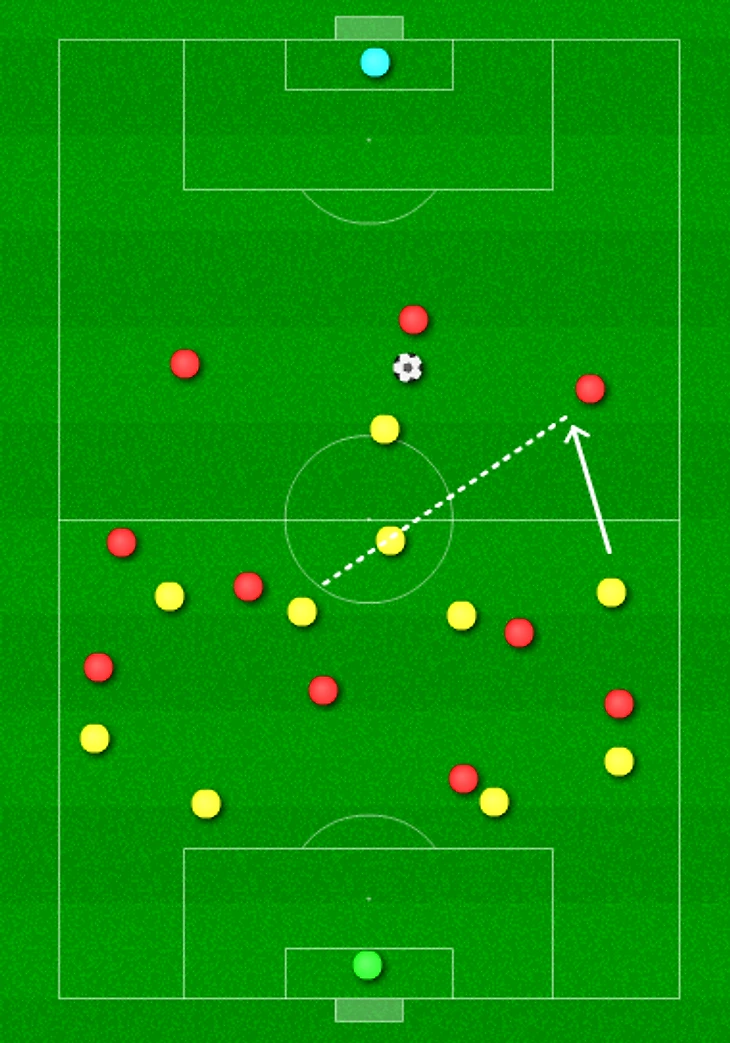 Под передачи открывался либо Лоди, который разгонял атаку, продвигаясь с мячом в ногах, либо Карраско, искавший варианты в центре, но, как правило, сваливавшийся на комбинации через Лоди — тот обеспечивал ширину атаки при таком сценарии. В основном они получали мяч в полуфланге. Иллюстрация выше. Левый фланг выбрали мишенью неслучайно — там играл Мюллер, который с точки зрения физики и функционала плохо адаптирован к переключениям от соперника к сопернику, а также не силен в том, что касается движения вслед за защитниками на свою половину.