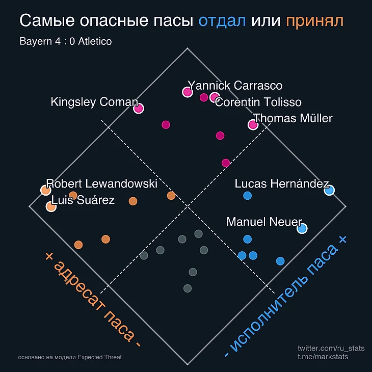 И вот здесь ещё ряд интересных моментов: «Атлетико» совсем чуть-чуть отстал от «Баварии» по передачам в финальную треть (177 против 170), передачам в штрафную (16 на 13), причём примерно такое соотношение сохранялось весь матч, в том числе ещё до голов «Баварии». Кроме того, зафиксировано примерное равенство по NSxG (по xT отрыв «Баварии» чуть больше), при этом хозяева создали просто кучу моментов и заслуженно победили с крупным счётом. Обычно в матчах против топов всё выглядит наоборот: «Атлетико» вжимается в свою треть, сильно уступает по xT и подобным ей метрикам, мало пасует, но не даёт создавать моменты у своих ворот. «Мы играли очень хорошо, шли нос к носу с европейским чемпионом, лучшей командой в мире. Возможно, это стоило нам счета на табло, но у нас были моменты», - интересная цитата Эктора Эрреры. Сразу стоит оговориться: моментов у «Атлетико» почти не было (Эррера вряд ли прав), но были неплохие выходы из-под прессинга и подходы к воротам, где не хватало пары передач до опасного момента (про нехватку передач — комплимент «Баварии»). Но больше всего выделяется фраза «стоило нам счёта на табло», которая косвенно подтверждает предположение о том, что Симеоне умышленно выбрал, по своим меркам, чересчур смелый план на игру. Если мы посмотрим на распределение явных моментов «Баварии» (а их всего четыре, включая два гола), то эта теория станет ещё более правильной и логичной. Один (гол Комана) — с позиционной атаки, в которой очень большая заслуга Киммиха, принявшего тонкое решение; два (второй гол Комана и момент Толиссо) — после быстрых атак, и это не совсем в стиле «Атлетико»; ещё один (удар Зюле) — после стандарта. Два других гола (Горецка, Толлисо) тоже пришли не из ситуаций, после которых справедливо было бы утверждать, что «Бавария» разнесла «супернадёжную позиционную оборону Симеоне»: прессинг и второй темп после стандарта. Прессинг/быстрые атаки — вопрос того, насколько смелым был план на конкретный матч. Зачастую у топовых соперников физически нет возможности накрыть «Атлетико» при розыгрышах от ворот, и Облак сразу выносит во вторую треть, а стандарты у своих ворот — проблема, которая тянется ещё с прошлого сезона. «Бавария» очень здорово воспользовалась этими слабостями, весомая часть которых возникла в силу открытости центра полузащиты «Атлетико», а также смелых установок, которые мы уже разобрали, но это («воспользовалась», а не «спровоцировала») уже всё-таки немного другой смысл и контекст, чем могло показаться изначально.