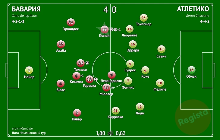 Ханс-Дитер Флик сделал всего одно изменение по сравнению с игрой против «Арминии» (4:1): Йозуа Киммих появился вместо Сержа Гнабри. Замена, как видно, не по позиции, и отсюда — целая цепочка перестановок: Толиссо из опорной зоны поднялся на позицию десятки, а Мюллер ушёл на правый фланг. Также стоит отметить, что этот сезон на флангах начинают не те персоналии, что заканчивали прошлый: из-за продажи Алькантары Киммих почти на постоянной основе перешёл в центр поля, вместо него в защите справа появляется Павар, который оказывался в старте в трёх из четырёх матчей в Бундеслиге, слева бровку занял Эрнандес — тоже три выхода в старте (у Дэвиса, тем не менее, две игры, но против «Герты» Альфонсо был вингером). У «Атлетико» всё чуть более интересно: отсутствовали Сауль, Хименес и Коста, причем последние двое борются за место в основе, и это, разумеется, сделало состав более ограниченным. Кроме того, Томас Парти перед самым закрытием трансферного окна уехал в Англию — ощутимая потеря. Тем не менее, у Симеоне оставался выбор: выпустить более классическое сочетание в центре поля, учитывая, что Торрейра по многим показателям похож на Томаса, либо сделать ставку на Эрреру и получить очень неплохо пасующий, но открытый центр.
