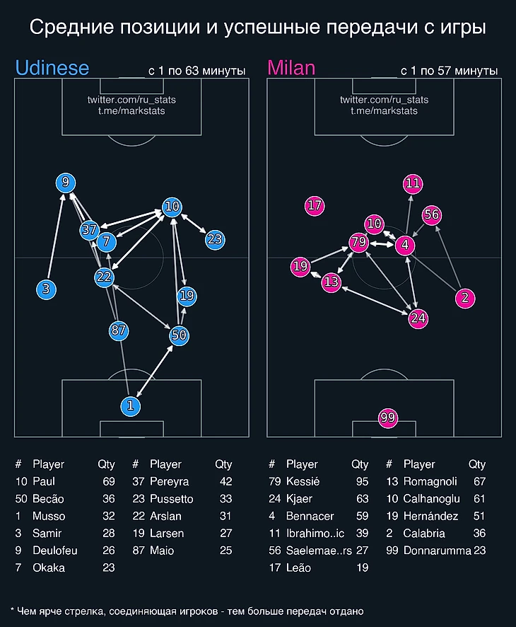 Вообще по прошлому сезону было достаточно забавно сравнивать результативные действия Тео и правых защитников: у первого – 6 голов + 3 ассиста , у Калабрия и Конти на пару – 1+3 (причем более продвинутая статистика лишь подтверждает эти данные). В этом матче картина получилась неоднозначной: с одной стороны, у обоих крайних защитников – по одному пасу под удар и по два кросса, атаки по направлениям распределены достаточно равномерно (33-35-31), с другой – по передачам в финальную треть Тео опережает Калабрия более чем в два раза (19:9), впереди по xT, плюс выше на карте усреднённых позиций.