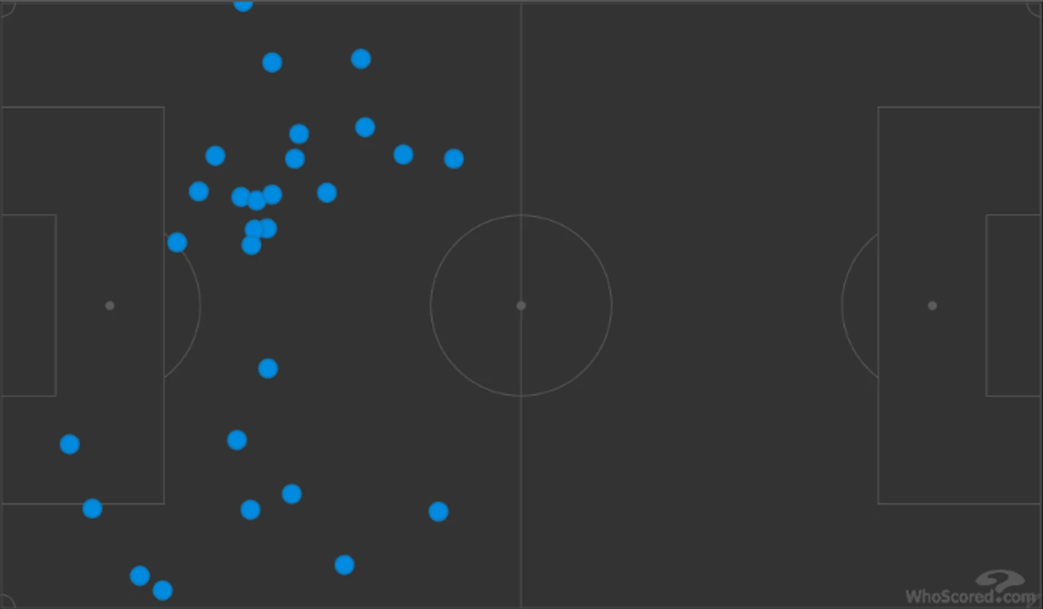 Здесь есть несколько моментов: большую часть отведённого ему времени Калабрия был достаточно активен при подключениях, а Салемакерс часто уходил в полуфланг, но там отразился в том числе и финальный отрезок игры защитника, когда уже сам Давиде чаще смещался ближе к центру (можно сказать, действовал, как ложный фулбек), а ширину обеспечивал вышедший на замену Диас.