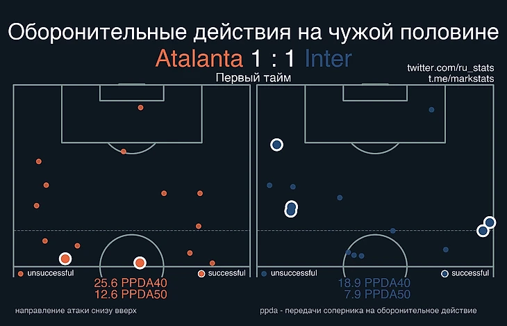 Глядя на сухие цифры по PPDA в первом тайме, можно составить мнение, будто "Интер" прессинговал достаточно интенсивно, и относительно "Аталанты" это действительно так. Другой вопрос, что в центре было минимум отборов – меньше риска, да и зажимать соперника на фланге легче, недаром Гвардиола говорил, что линия аута – лучший защитник. Ещё одна интересная деталь – на трети "Аталанты" в первом тайме прошло лишь 23% от всех действий (на трети "Интера" – 33%).