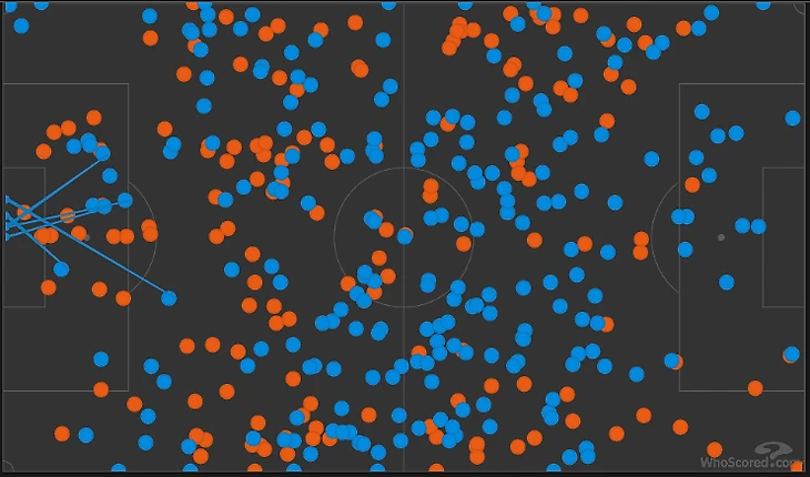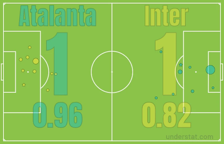 Все касания в промежуток от 45 до 73 минуты: много – во второй и финальной для "Интера" трети. По ударам – 5:0 в пользу миланцев, и в эти пять ударов уместились гол Лаутаро и явный момент после выхода один на один у Артуро Видаля. Весьма показательна и сама ситуация, из которой пришёл гол: от момента, когда Санчес получил мяч (закончилось владение "Аталанты"), до гола Мартинеса прошло 46 секунд – всё это время "Интер" владел мячом. По меркам "Аталанты" это долго, обычно они вступают в прессинг/контрпрессинг и стараются вернуть себе владение. Здесь же в этот промежуток времени уместилось 15 передач.