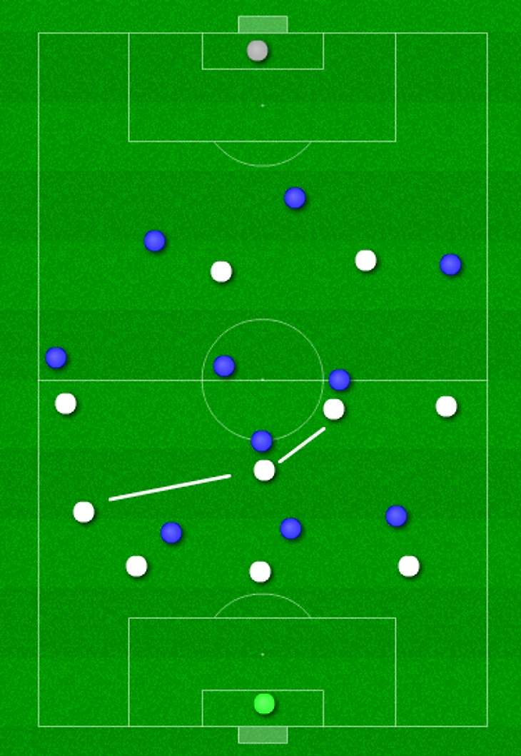 Разбить прессинг помогал вот такой приём, который успешно пользовались оба соперника: к тройке защитников опускался дополнительный игрок из числа центральных полузащитников (чаще всех такое делал Видаль). Это типичный приём для создания численного преимущества при билдапе с использованием хавбека, хотя многое зависит от схемы – сколько человек находится в центре полузащиты, каким образом они располагаются относительно друг друга. И здесь было возможно два сценария. Первый: кто-то из полузащитников идёт до конца за Видалем/Гомесом (у "Аталанты" чаще всего опускался именно Алехандро), персональные ориентировки жёстко соблюдаются, хотя это грозит быстрыми атаками через центр – там становится больше пространства. Такой вариант более рискованный, требует бОльших затрат в плане физики. Второй сценарий: соперник даёт свободу при розыгрышах, не желает рисковать, открывая центр, и рисунка игры в том виде, в котором его возможно было наблюдать изначально со строгим соблюдением персональных ориентировок, высоким темпом, множеством опасных атак, в конкретном матче мы не увидим. Весьма показательно, что за первый тайм команды на двоих набрали лишь 0,60 xG (0,33 на 0,27 в пользу "Аталанты").