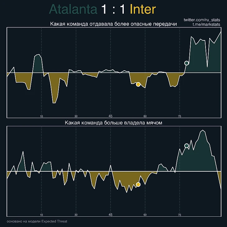 Краткое резюме этого отрезка можно увидеть на графике: "Интер" забрал себе владение и доминировал по xT. В матчах с участием "Аталанты" второе почти всегда следует за первым, позиционная оборона – слабость команды Гасперини. Важно вспомнить и про момент Видаля – он был более явным, чем удар Лаутаро. Реализуй Артуро свой шанс (выход один на один после провала редкой попытки прессинга "Аталанты") – игра бы наверняка была сделана.
