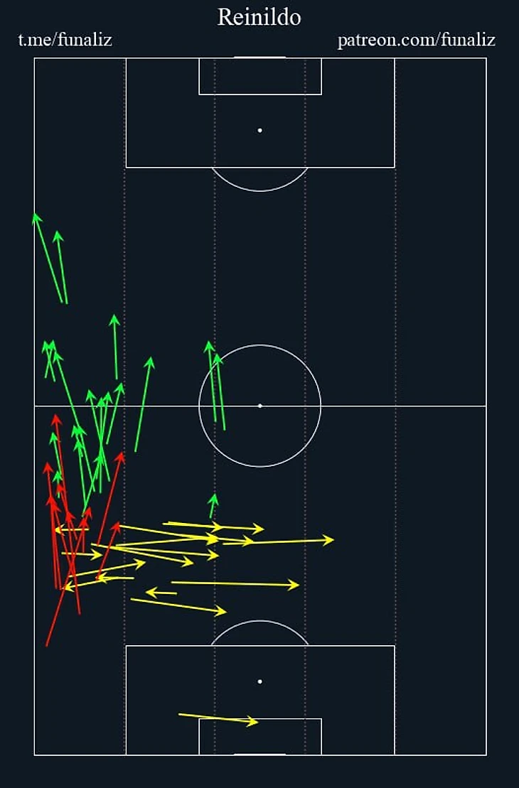 Рейнилду — полная противоположность: очень мощен 1v1, здорово обороняется на пространстве, при этом слаб в созидании. Это неплохо подсвечивает кластеринг передач, наиболее выделяющих его относительно других ЦЗ Ла Лиги: Рей ищет безопасные варианты, если и продвигает мяч, то, как правило, линейно во фланг.