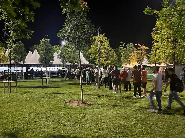 Так выглядит очередь в палатки с едой, где работает 1(!) касса. До этого попить можно было взять в зоне Пепси. Сейчас нет даже такой опции. Воды нет в свободном доступе вообще.