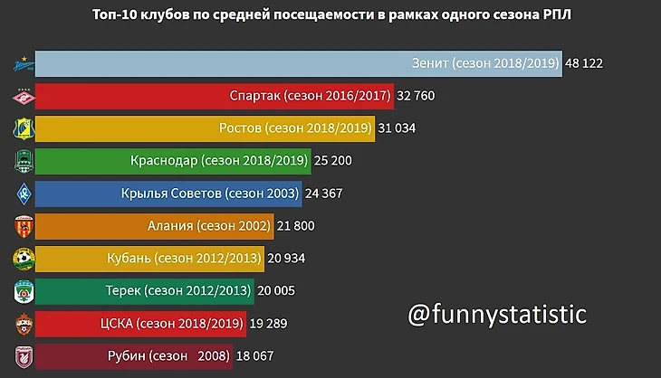 Топ-10 клубов по средней домашней посещаемости в рамках одного сезона РПЛ: