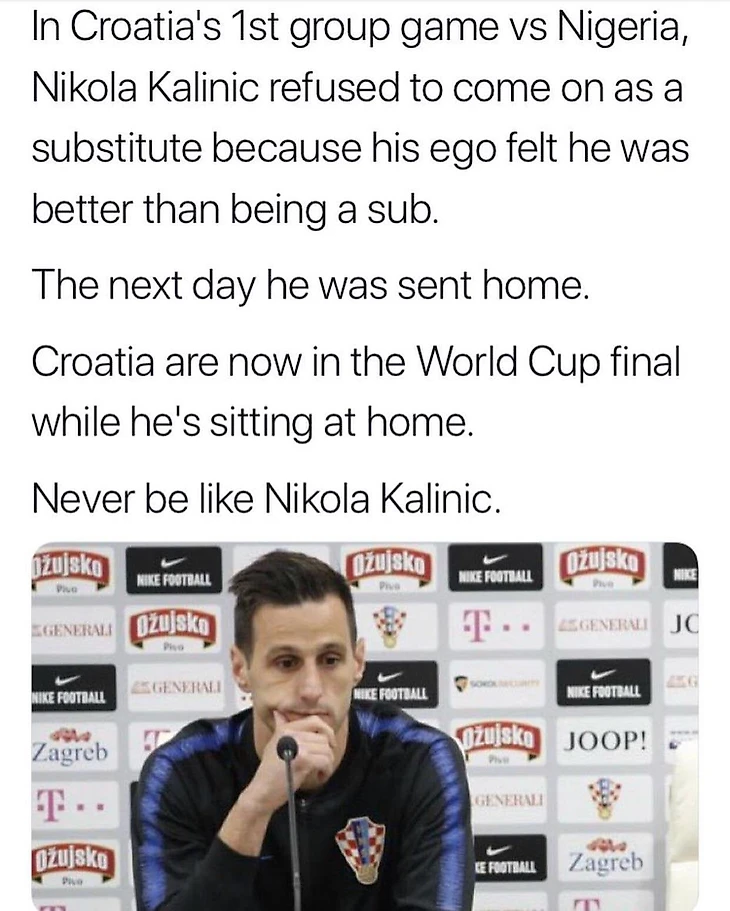 В 1-й групповой игре Хорватия vs Нигерии, Никола Калинич отказался выходить на замену, потому что его эго почувствовало, что он лучше чем игрок замены.