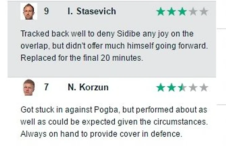 Хотя забей Сигневич на 22-й минуте после подачи Калачева - цифры стали бы лишь никчемным придатком истории. В моменте поучаствовал и Стасевич, сыгравший по мнению многих слабо, но, справедливости ради, отмечу: если бы их дуэт с Бордачевым давал Сидибе такую же свободу, какая была у Курзава, то все могло бы закончиться плачевно. Интересна оценка портала goal.com. Там Стасевич котируется даже выше приглянувшегося вчера Корзуна: