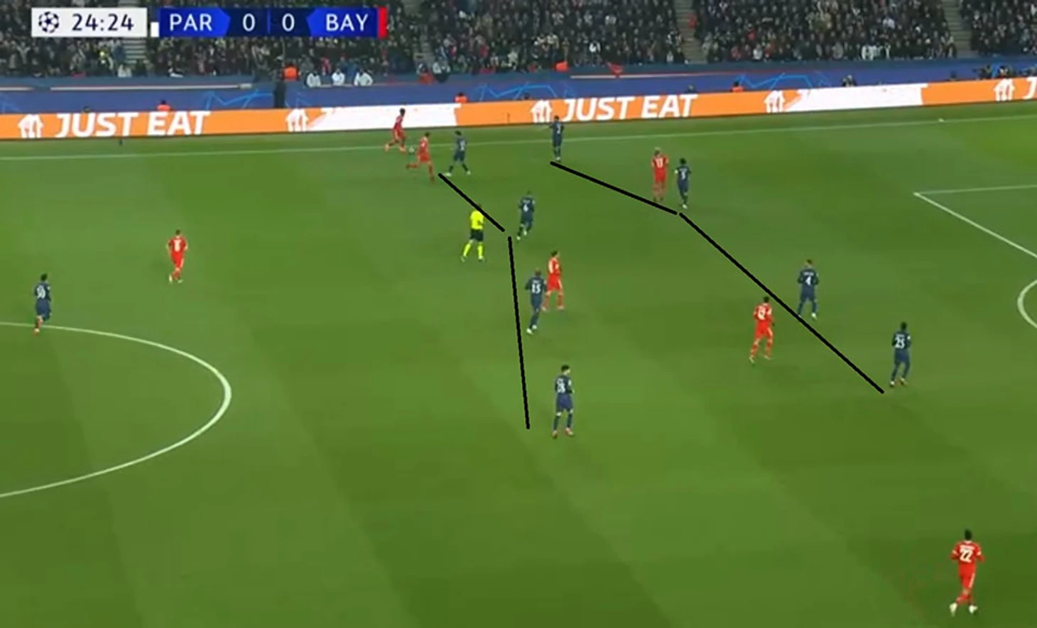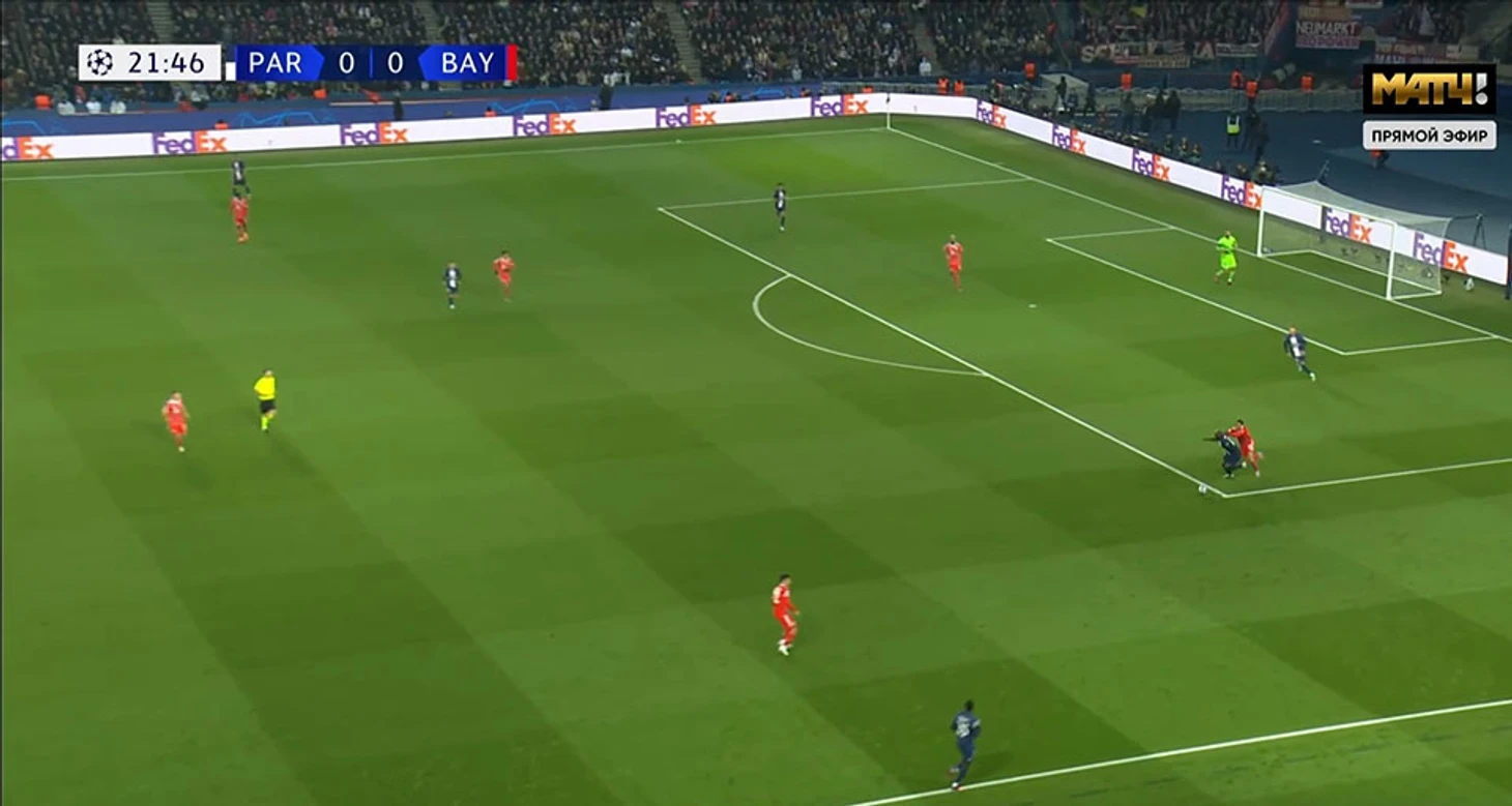 Нагельсман (на полтайма уж точно) частично привязал Мусиалу к Верратти. Марко входит в топ-5 европейских лиг по успешным попыткам продвижения через дриблинг (79%). Такая полумера дала частичный эффект, глобально ни на что не повлияв. «Бавария» прессинговала активной четверкой ближе к флангам. «ПСЖ» вдавливали к границам штрафной, а высокие позиции Упамекано и Де Лигта страховали от шального выхода через дальний пас.