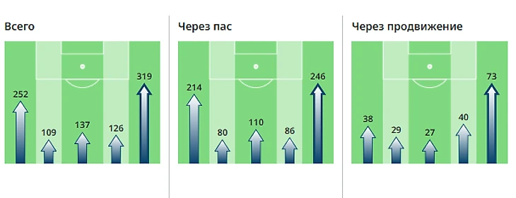 2) Также стоит отметить более частые подключения в атаку основного правого защитника (Зеки Алиева) по сравнению со своим визави на левом фланге (Максим Тарасенко). Из-за чего атаки на правом фланге получаются более конструктивными.