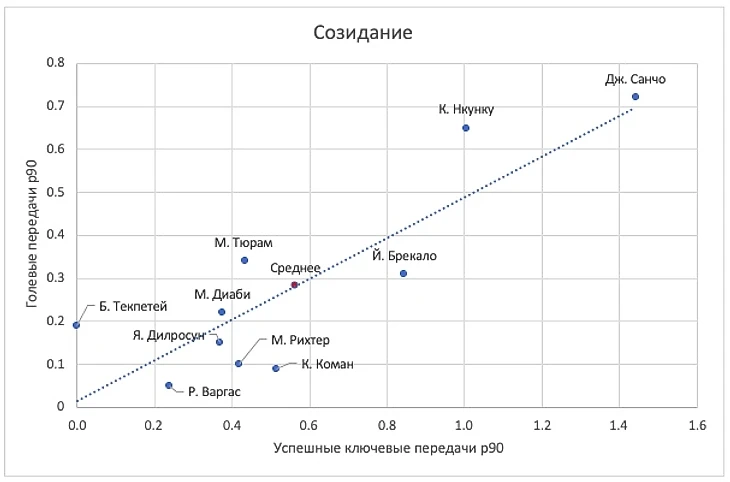 Тут картина сильно меняется: кто был самым неэффективным оказался самым созидающим и полезным. Нкунку и Санчо здесь с большим отрывом от остальной группы. Также на общем фоне выделяются Йосип Брекало (Вольфсбург) по числу точных ключевых передач и Маркус Тюрам (Мёнхенгладбах) по голевым передачам.