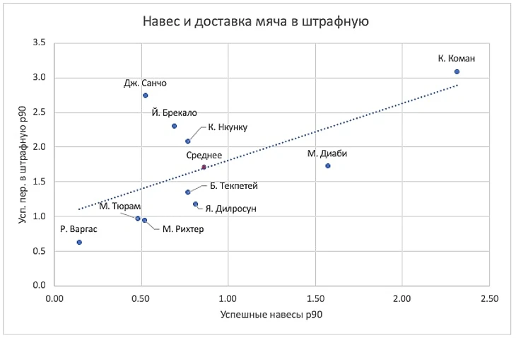 Тоже получаем весьма любопытные данные, где Коман оказывается лучшим и в навесах, и в передачах, а Санчо ничем не уступает в передаче низом в штрафную. Хорошо выглядит и Диаби.