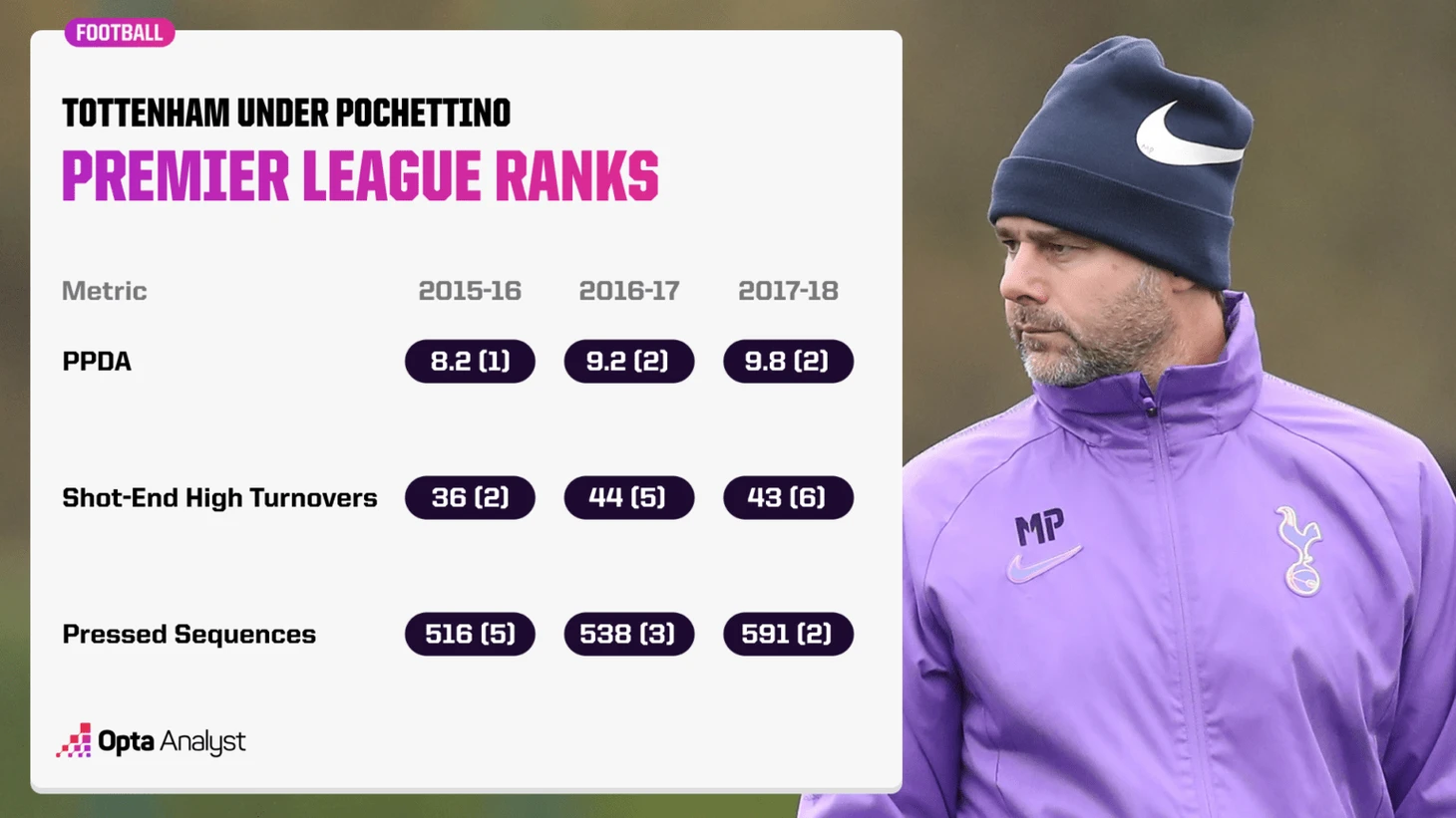 Чтобы не быть голословными, давайте взглянем на проделанную аргентинцем за пять лет в «Тоттенхеме» работу. Возьмём период после сезона 2014/15, когда только начала строиться команда, и до спада в сезоне 2018/19, когда ценой невероятного выступления в Лиге чемпионов стала позиция в чемпионате.