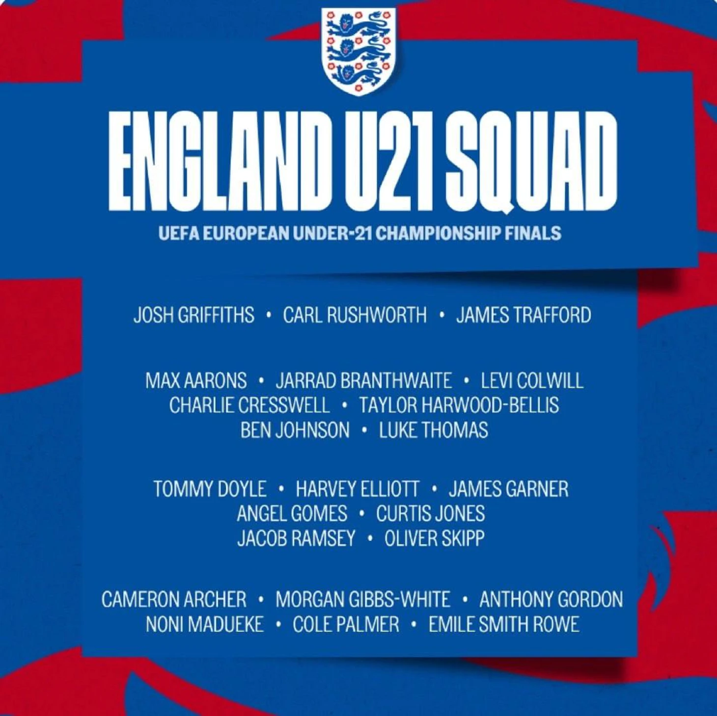 В составе молодых «львов» Ли Карсли собрано множество ярких и талантливых игроков, многих из которых мы с вами видели на полях АПЛ не первый сезон. Оливер Скипп («Тоттенхем», 1+0), Кёртис Джонс («Ливерпуль», 3+1), Джейкоб Рэмси («Астон Вилла, 6+8), Морган Гиббс-Уайт («Ноттингем Форест», 5+8), Энтони Гордон («Ньюкасл», 4+0), Эмиль Смит Роу («Арсенал», 0+2), Нони Мадуэке («Челси», 1+0), Леви Колвилл (молодежная команда «Челси», был в аренде в «Брайтоне», 0+30, Льюис Холл (молодёжная команда «Челси», 5+5), Люк Томас («Лестер Сити», 0+1), Рико Льюис («Манчестер Сити», 1+0) и другие громкие имена.