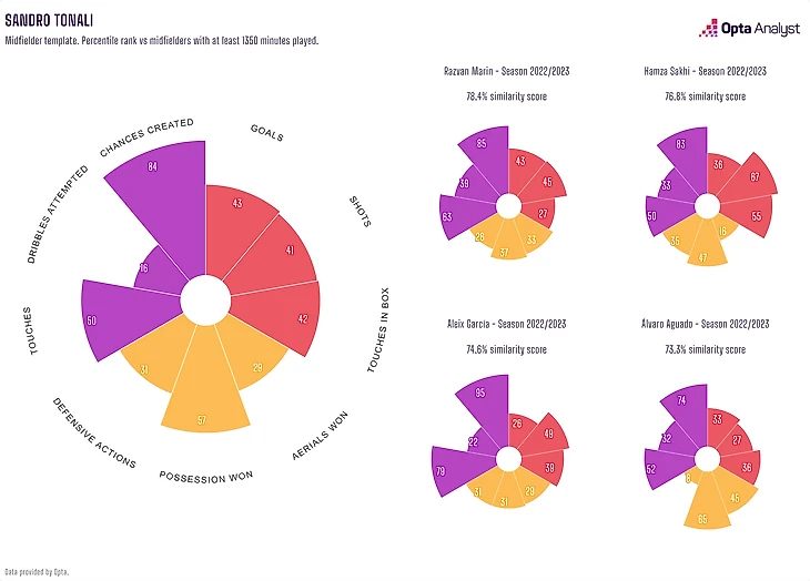 Если обратиться к новому инструменту от Opta Analyst, то показатели Тонали явно отличаются от цифр топ-исполнителей: наиболее близки к полузащитнику «Милана» Разван Марин из «Эмполи», Алеш Гарсия «Жироны», Хамза Сахи из «Осера» и Альваро Агуадо из «Вальядолида».