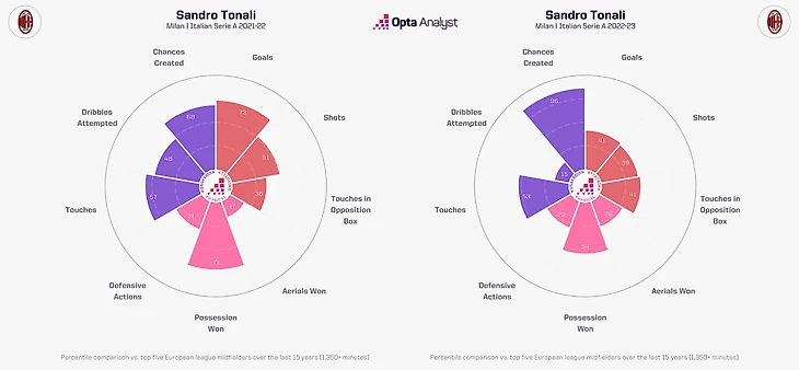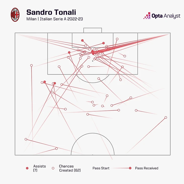 В 36 матчах лиги, 31 из которых игрок сыграл с первых минут, в триумфальном сезоне 2021/22 Тонали отлично сыгрался с Франком Кессье, забил пять мячей и отдал две голевые передачи. Для главного тренера «Милана» Стефано Пиоли Тонали был практически безальтернативной опцией, ведь игрок выходил на поле чаще, чем любой другой полузащитник, но игрок все еще пытался улучшить свою игру. И эти попытки увенчались успехом: уже в следующем сезоне Сандро изменил свой стиль игры, забив лишь дважды в лиге, но при этом улучшив показатель голевых передач. 23-летний полузащитник отдал 7 голевых передач – 2 в прошлом сезоне, и создал больше голевых моментов для партнеров – 62 в сезоне 2022/23 против 44 в сезоне 2021/22. Он также стал отдавать больше передач, но при этом упала их точность: с 85.5% до 81.0%. Немного увеличился и средний показатель отданных передач вперед – 14.2 за 90 мин и 13.8 в предыдущем сезоне – что идёт вразрез с ухудшением точности передач на 4.5%, ведь как он даже стал отдавать меньше длинных передач.