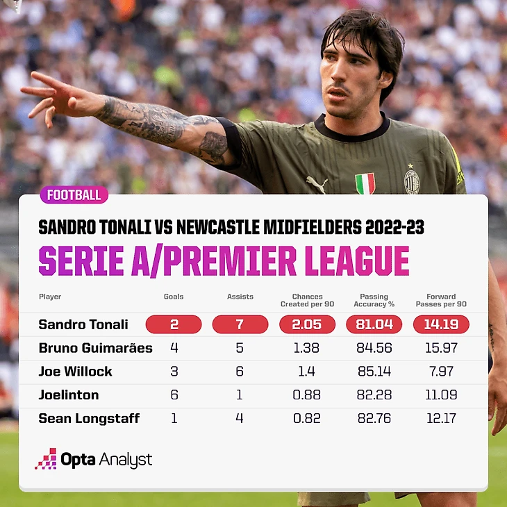 Итальянец должен будет вернуть показатель точности передач к уровню сезона 2021/22, ведь в прошлом сезоне у Гимарайша, Уиллока, Шона Лонгстаффа и Жоэлинтона точность передач в лиге была выше, чем у Тонали в Серии А, хотя только Гимарайш (5.6) совершил больше длинных передач за 90 мин, чем Тонали (5.4). Бразилец (16.0) также стал единственным полузащитником «Ньюкасла», совершившим больше передач вперед за 90 мин (14.2).