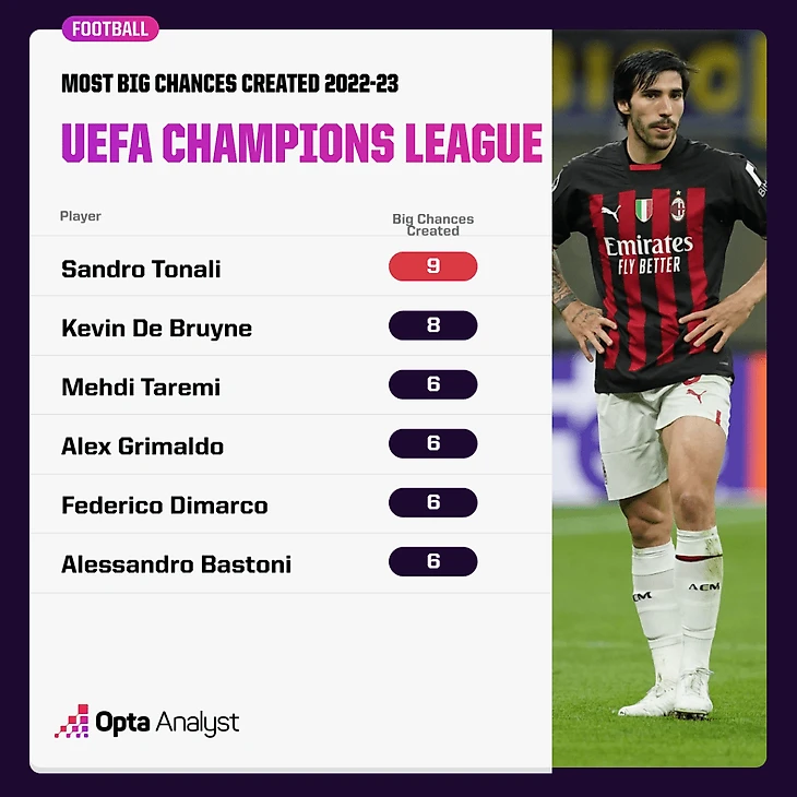 В минувшем розыгрыше Лиги чемпионов Сандро создал 22 голевых момента – лучший показатель среди игроков «Милана» в одном сезоне со времен Кларенса Зеедорфа в сезоне 2006/07 (24). И только Джек Грилиш из «Манчестер Сити» (35) и Пётр Зелиньски (23) из «Наполи» создали больше. Тонали также создал больше явных голевых моментов (9) – ситуаций, в которых игрок при прочих равных должен забивать – чем любой другой игрок в том розыгрыша турнира.