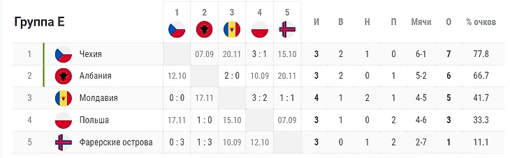 Поляки уступили молдаванам (2-3) и чехам (1-3). Между двумя поражениями Польша обыграла албанцев (1-0). В сентябрьском окне для сборных у подопечных Фернанду Сантуша прекрасный шанс поправить турнирное положение: игра с аутсайдером группы Фарерскими островами и очный “стык” с Албанией. Лидеры по результативным действиям Роберт Левандовски (“Барселона”) – 1+1, Аркадиуш Милик (“Ювентус”) – 1+1.