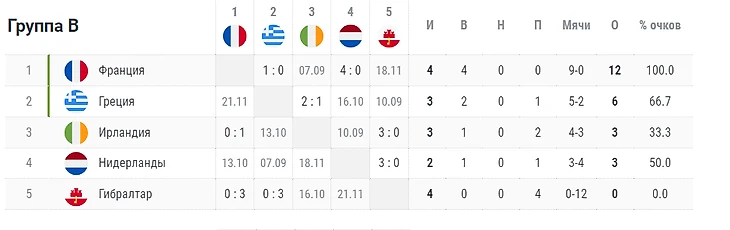 Нидерланды вынуждены догонять соперников по группе не только по очкам, но и по количеству игр. По потерянным очкам они идут вровень с Грецией. После разгрома от французов со счётом 0-4, голландцы немного реабилитировались в игре с Гибралтаром 3-0. Лучший бомбардир оранжевых после двух туров – защитник "Манчестер Сити" Натан Акé с 2 голами. Другой защитник Дензел Дюмфрис ("Интер") отличился двумя голевыми передачами.