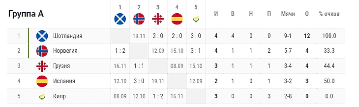 Шотландцы уверенно возглавляют отборочную группу после 4 побед. Лучшим бомбардиром команды является полузащитник “Манчестер Юнайтед” Скотт МакТоминей с 5 голами. Также отметим результативные действия форварда “Куинз Парк Рейнджерс” Лайндона Дайкса (1 гол + 2 ассиста) и защитника “Ливерпуля” Эндрю Робертсона с 3 голевыми передачами. Вратарь Ангус Ганн, представляющий “Норвич Сити”, в 4 матчах пропустил всего один гол.