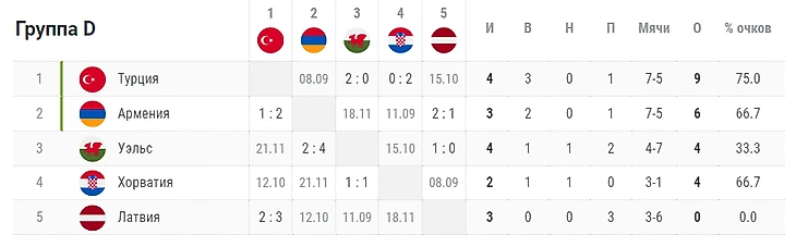 После двух поражений на старте от Турции (0-2) и Армении (2-4) валлийцы сломили сопротивление Латвии (1-0) и дожали хорватов (1-1). В сентябре Уэльс проведет ответную встречу с латышами и в случае удачного исхода может приблизиться к группе лидеров, которые будут терять очки между собой. Отметим результативные действия Дэниела Джеймса (“Лидс”) – 1+1, а также Киффера Мура (“Борнмут”) – 1+1.