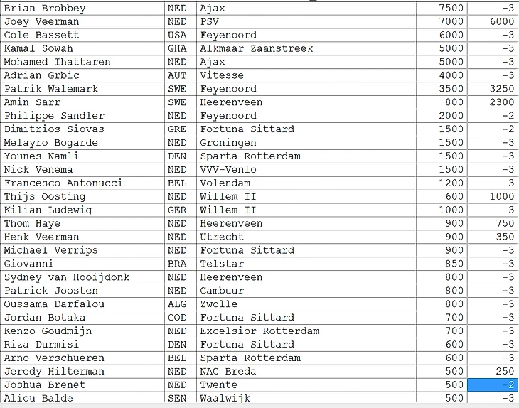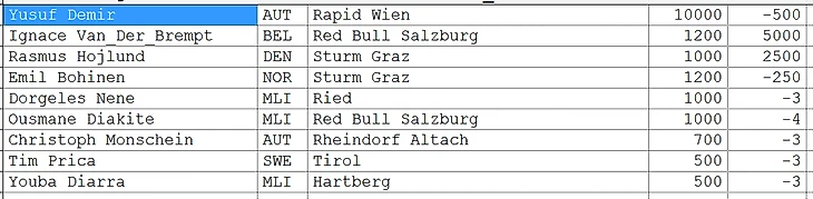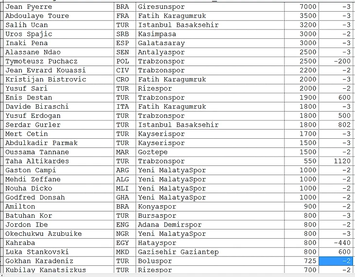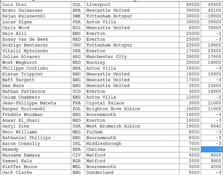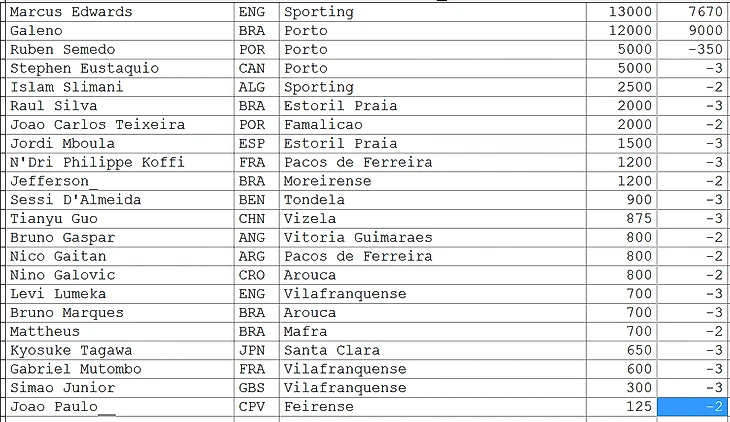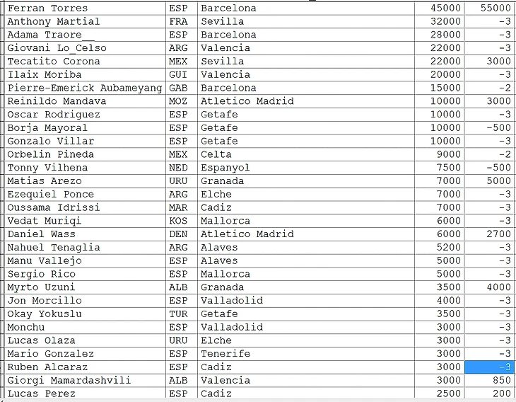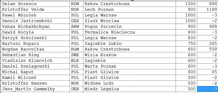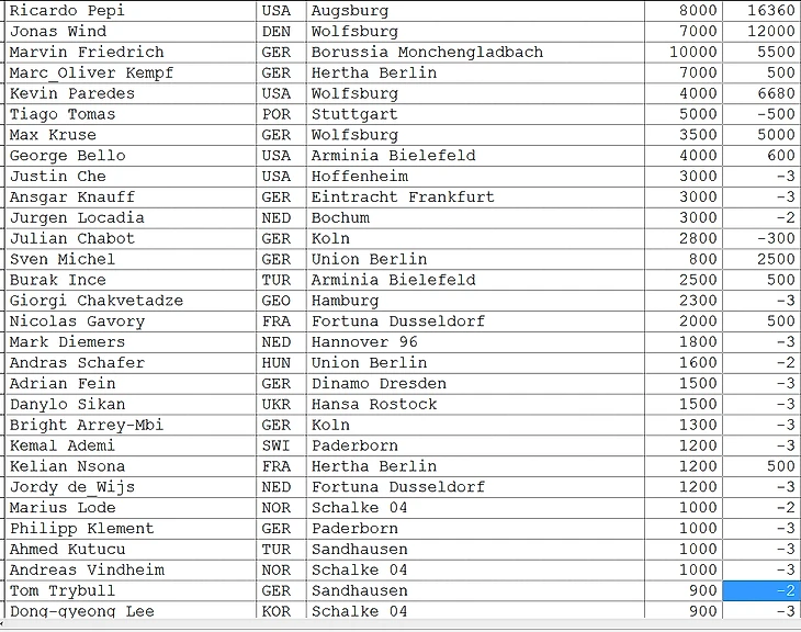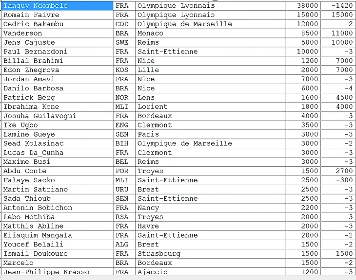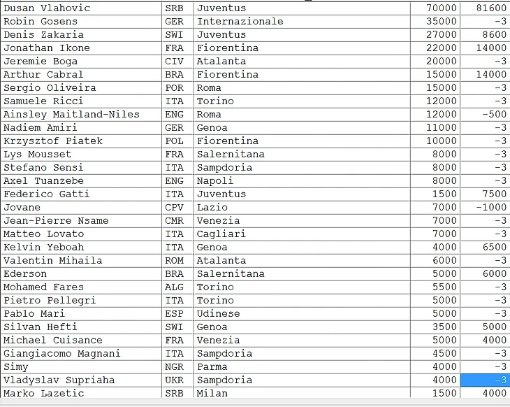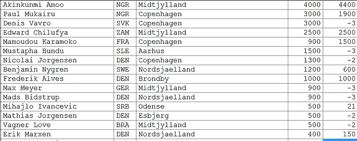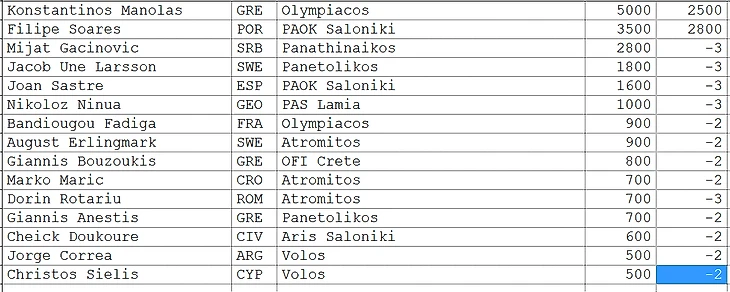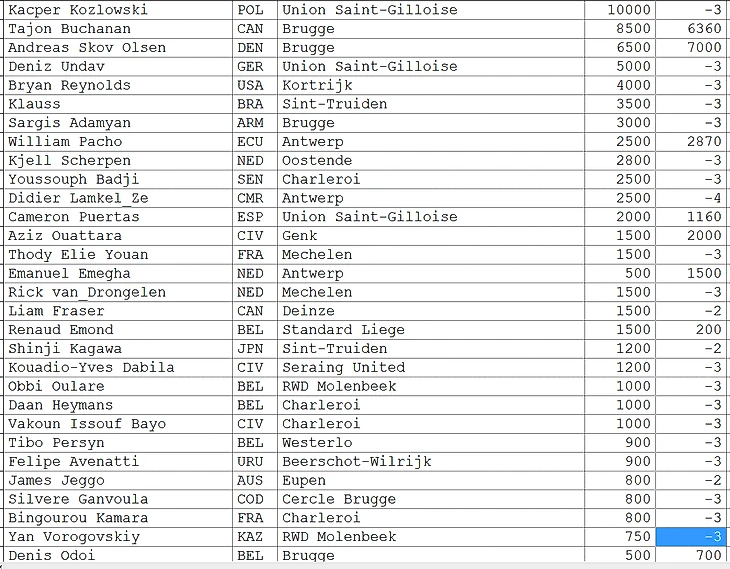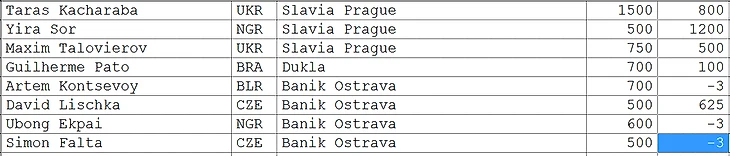 *Ко всем таблицам : 5я (последняя)колонка - сумма купли; 4я колонка - оценка TransferMarket