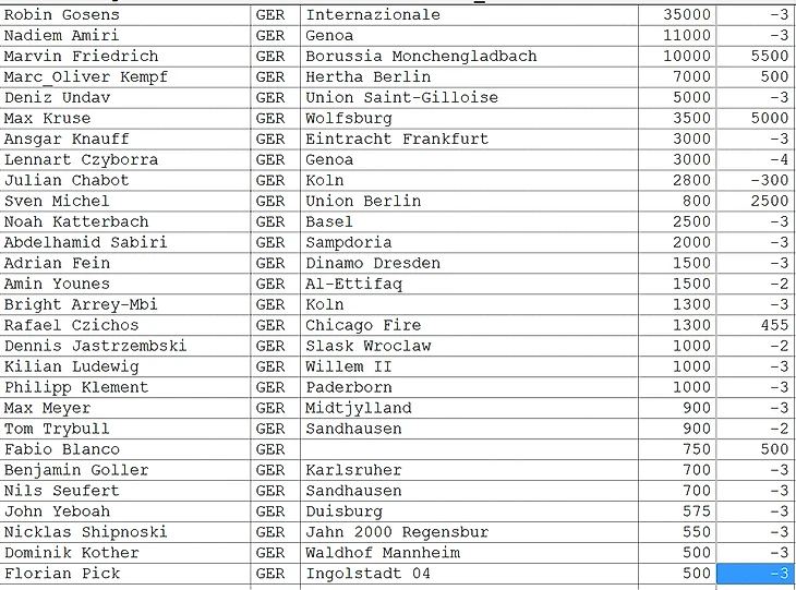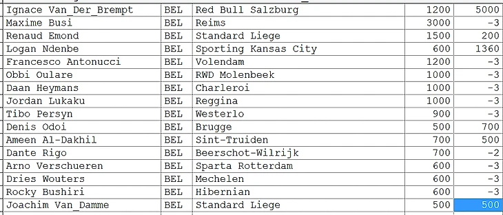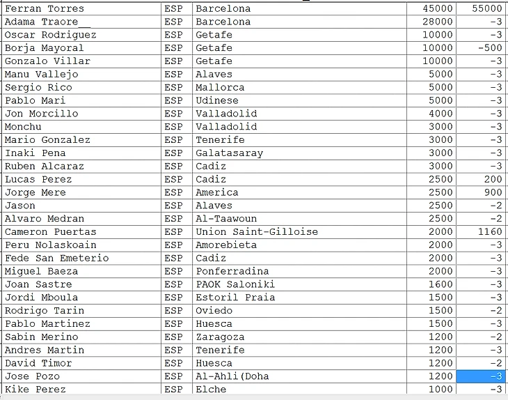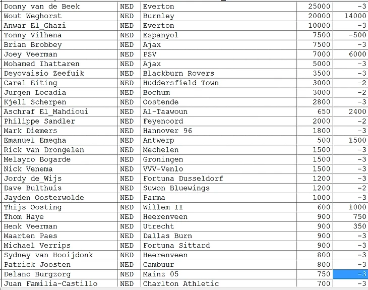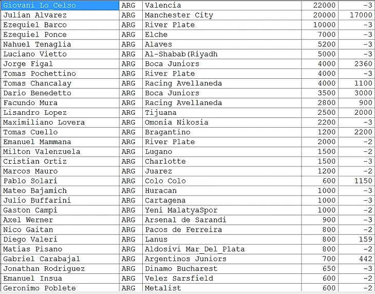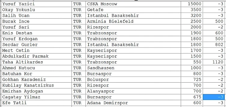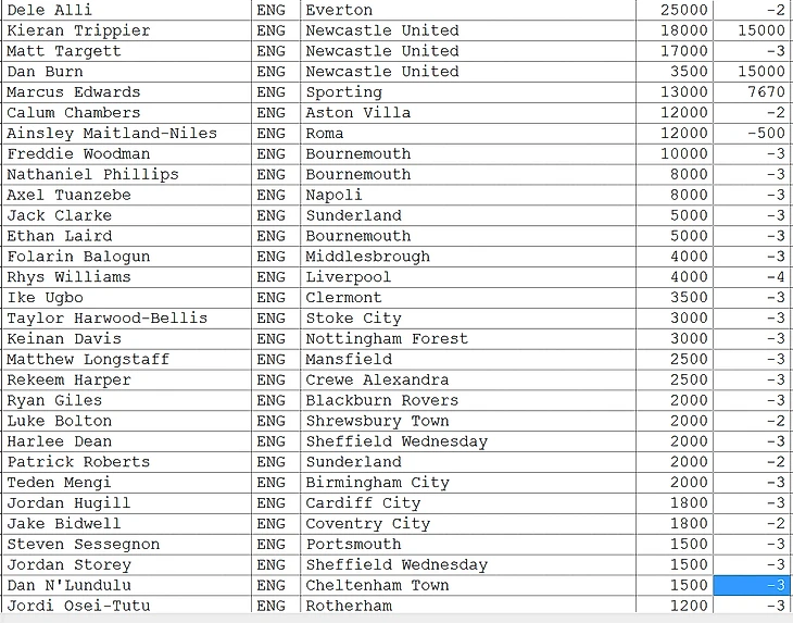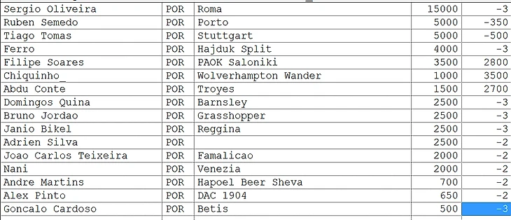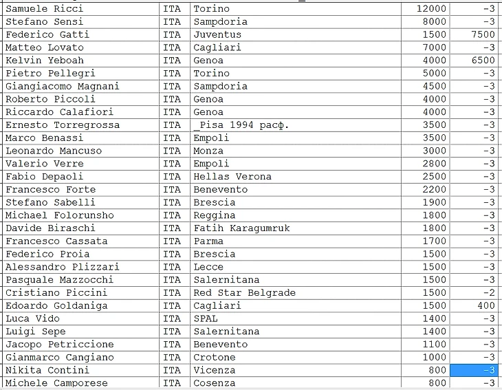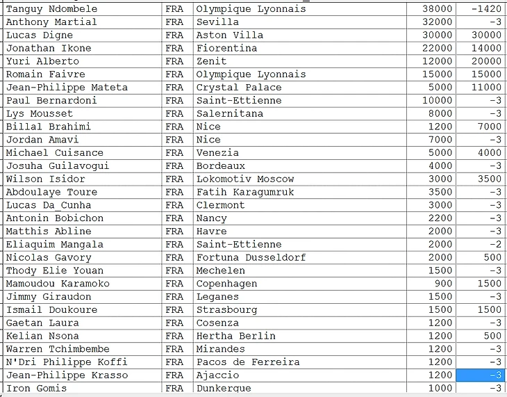 *Ко всем таблицам : 5я (последняя)колонка - сумма купли; 4я колонка - оценка TransferMarket