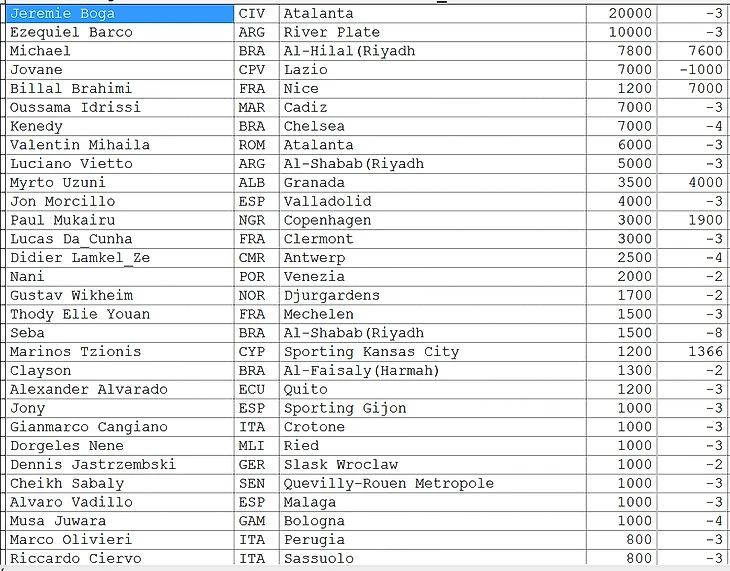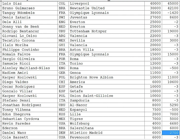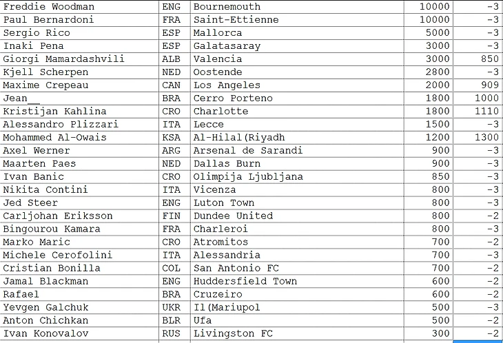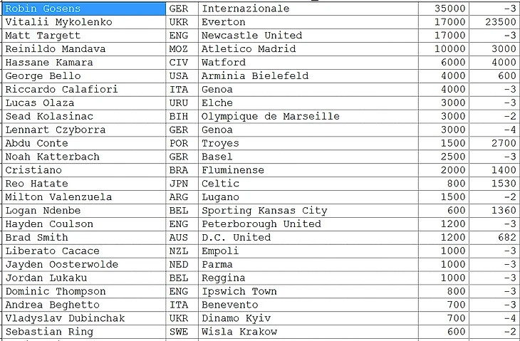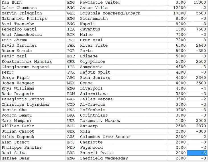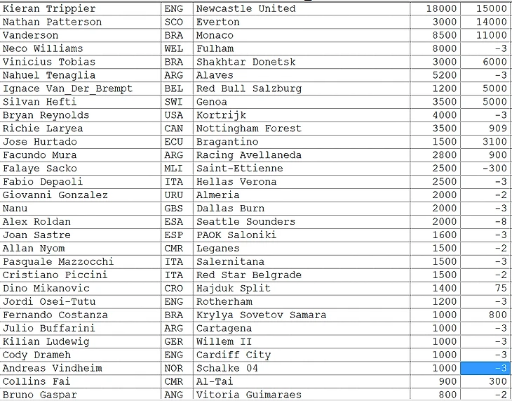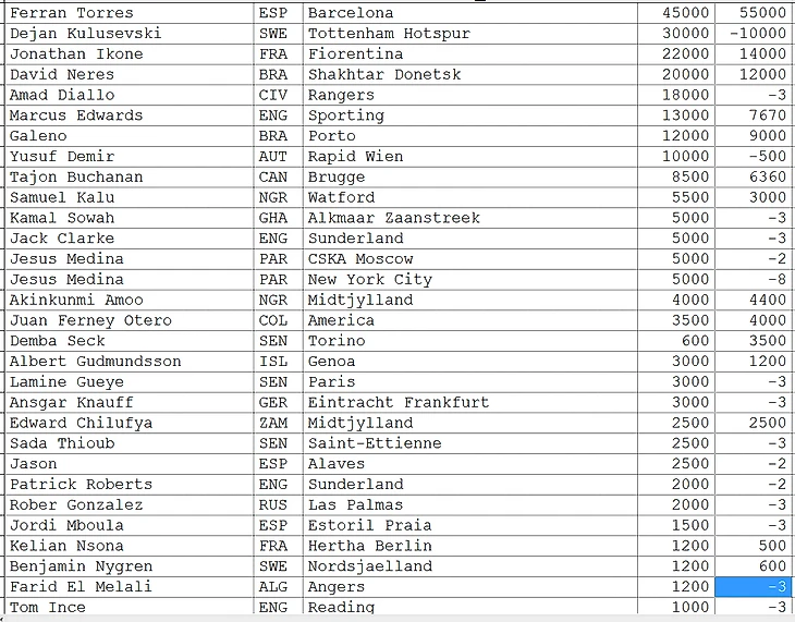 *Ко всем таблицам : 5я (последняя)колонка - сумма купли; 4я колонка - оценка TransferMarket