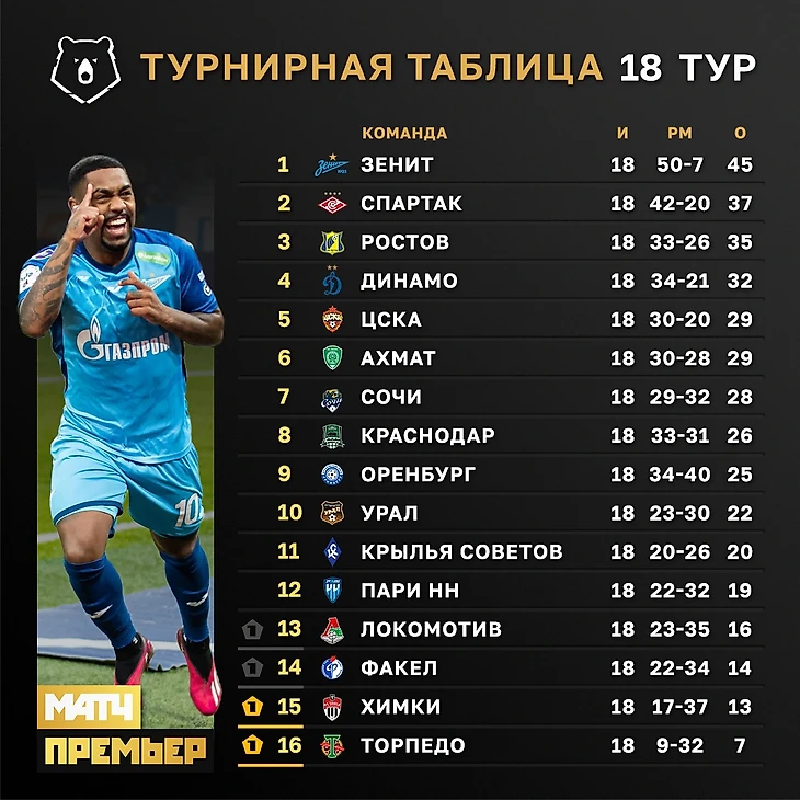 Лучшие бомбардиры: Малком (»Зенит»), Квинси Промес (»Спартак») и Владимир Писарский (»Крылья Советов») - по 14 голов.