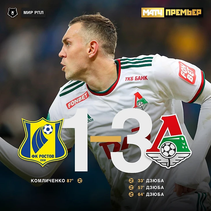 Также Дзюба стал первым футболистом в истории, перешагнувшим планку в 150 голов в чемпионате России, теперь у него 151 гол. Кроме того, Дзюба - рекордсмен РПЛ по хет-трикам (6), у ближайших преследователей по 4. (информация: портал Opta).