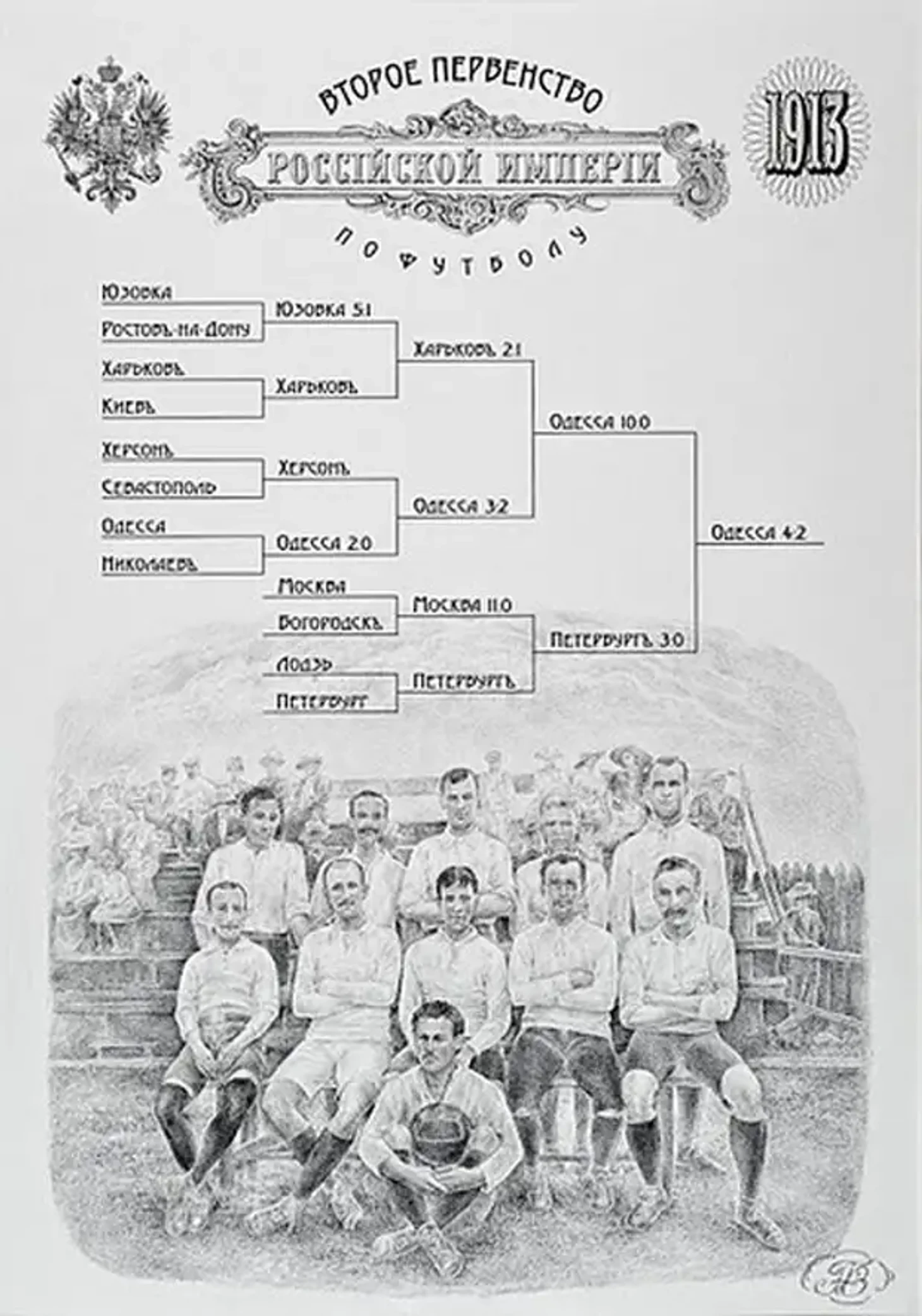 В 1912 году создается Всероссийский Футбольный Союз, который включает в себя более 30 крупных городов и столько же футбольных клубов. В 1912 году в Российской империи прошел футбольный турнир, в который вошли Санкт-Петербург, Москва и Харьков. Одесса и Киев вначале тоже планировали войти в клуб и показать квалифицированную игру, но по независящим причинам, команды снялись с участия. В ¼ финала Харьков проиграл Москве со счетом 1:6. Сборная Киева не решилась принимать участие в игре с Санкт-Петербургом, и поэтому была дисквалифицирована. В полуфинале Москва и Санкт-Петербург встретились на футбольном поле и показали действительно красивую игру, которая закончилась вничью 2:2. Из-за тумана, который был в этот день, матч предложено было переиграть. Вот тут сборная Санкт-Петербурга оторвалась от сборной Москвы со счетом 4:1. Сборной Одессы было предложено сыграть со сборной Санкт-Петербурга, но игра так и не состоялась. И в 1912 году сборная Питера была провозглашена чемпионом России (что изменилось за 100 лет?)