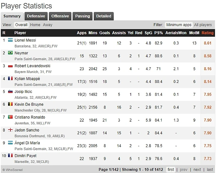 Капитан "Барселоны" предсказуемо занимает первую строчку рейтинга, но дальше много сюрпризов. Например, Неймар обошел своего одноклубника Килиана Мбаппе, заняв второе место (француз же — только четвертый, уступает и Неймару, и форварду "Баварии" Роберту Левандовски).