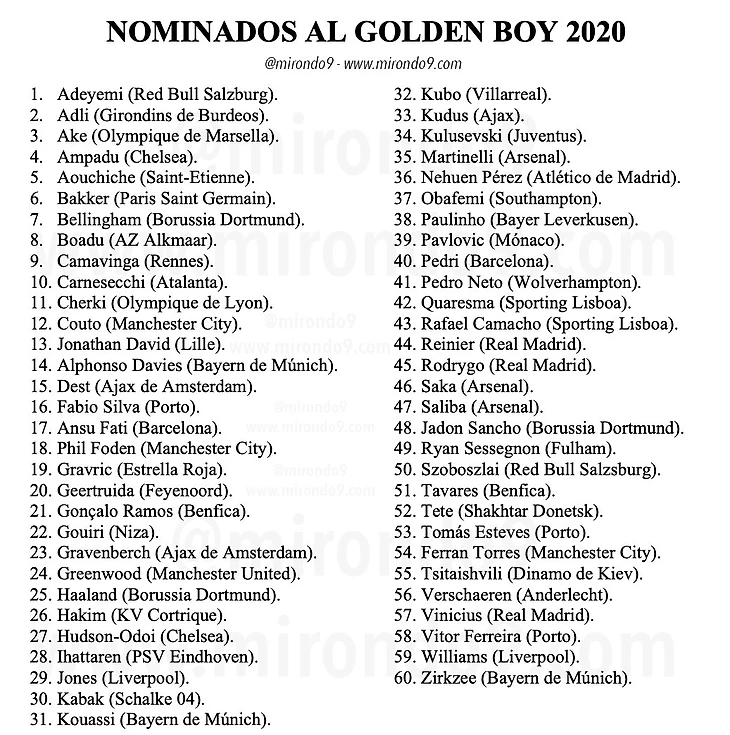 В июле в сети был опубликован список из 80 финалистов премии «Golden Boy 2020». Теперь же в СМИ появился шорт-лист из 60 номинантов в который вошли только самые талантливые молодые игроки Европы.