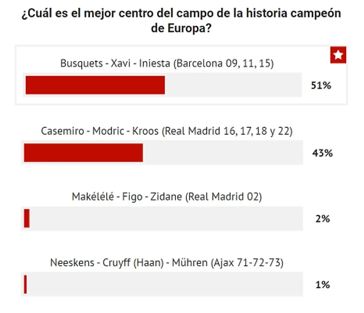 Первые два места заняли игроки «Реала» и «Барсы». За центр поля Каземиро-Модрич-Кроос проголосовало 43%, трио Хави-Иньеста-Бускетс набрало 51% голосов.