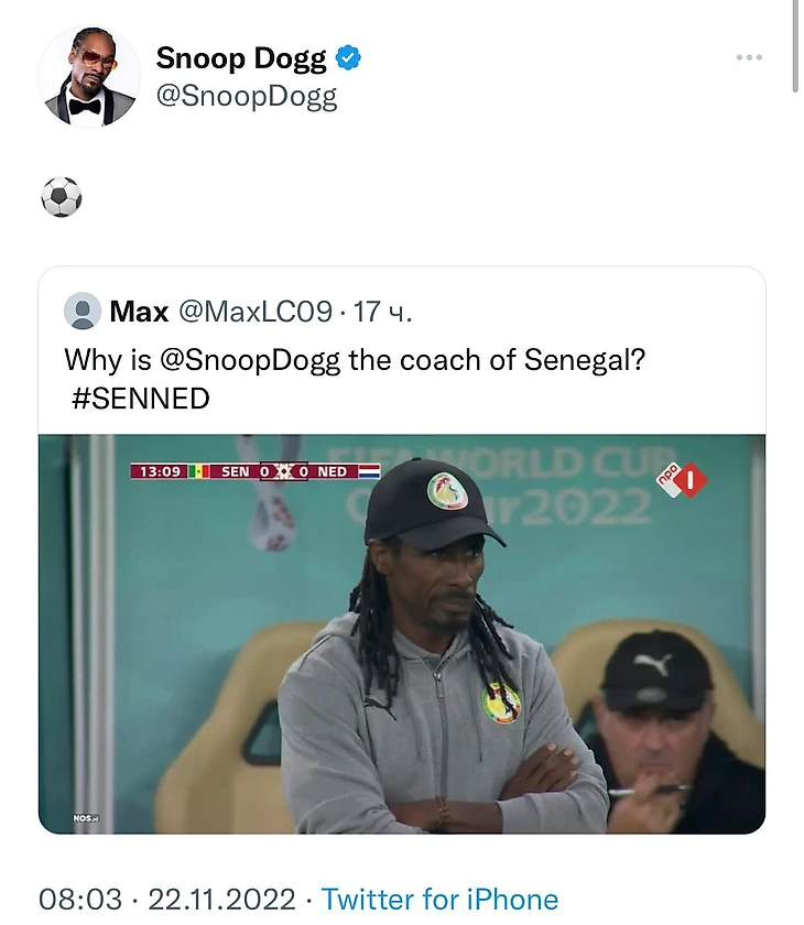 Во время матча ЧМ-2022 между сборными Сенегала и Нидерландов многие болельщики в соцсетях с удивлением обнаружили на скамейке африканской сборной знаменитого рэпера Snoop Dog’a.